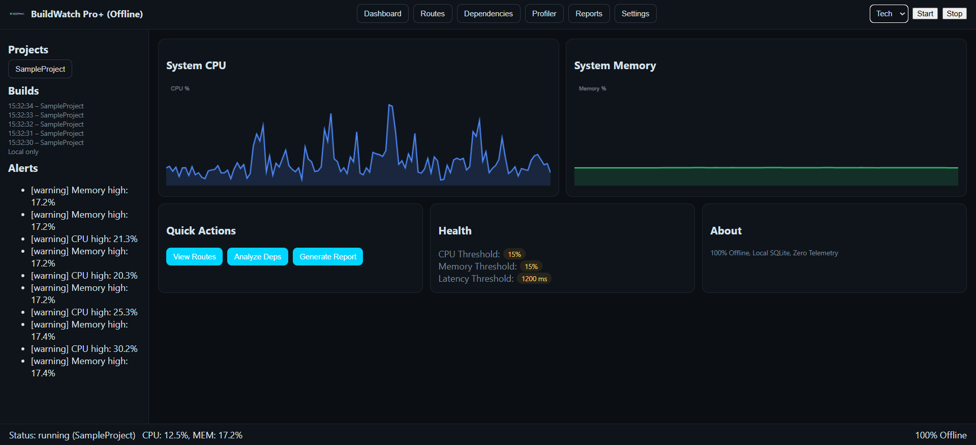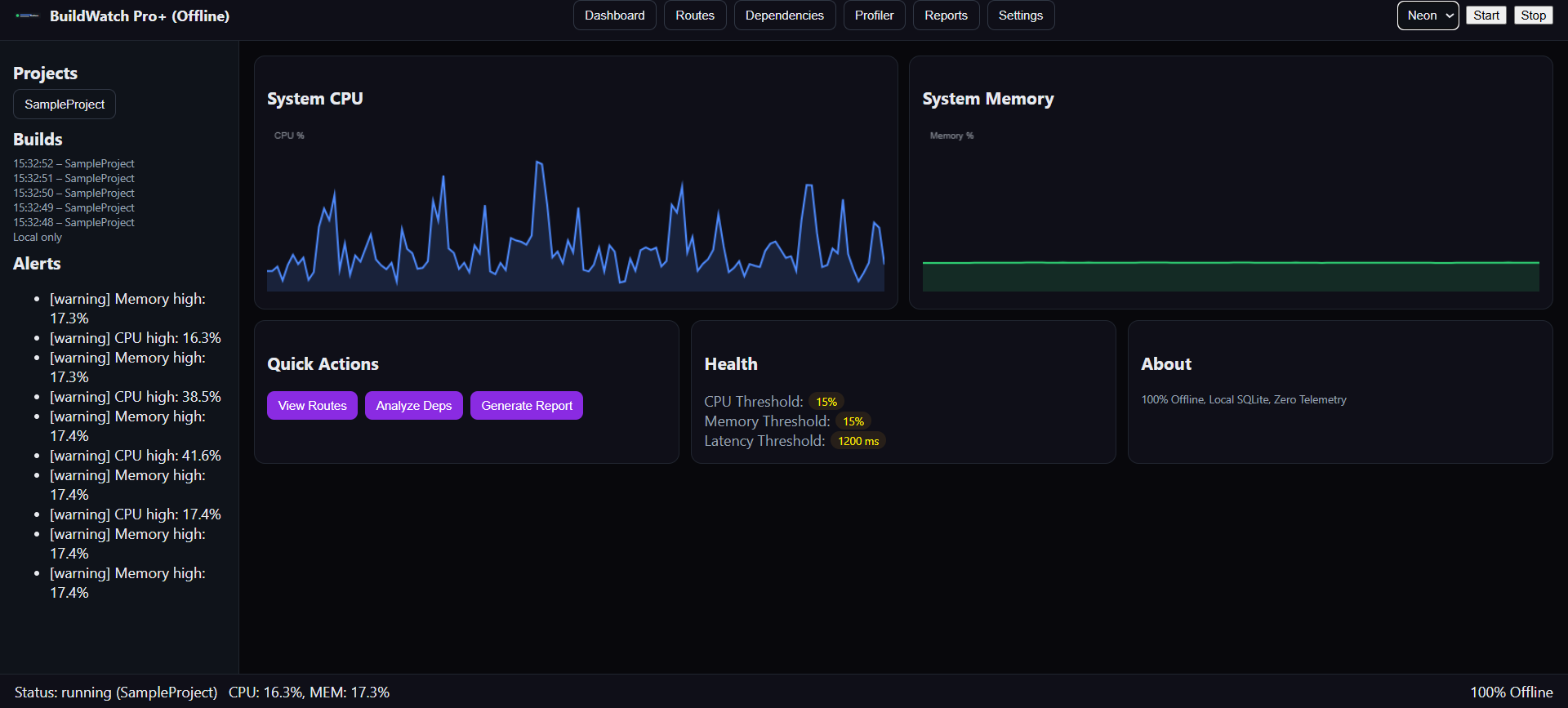 BuildWatch Pro+ (Offline Edition) is a local-first performance and profiling dashboard for FastAPI, Python apps, and backend systems.