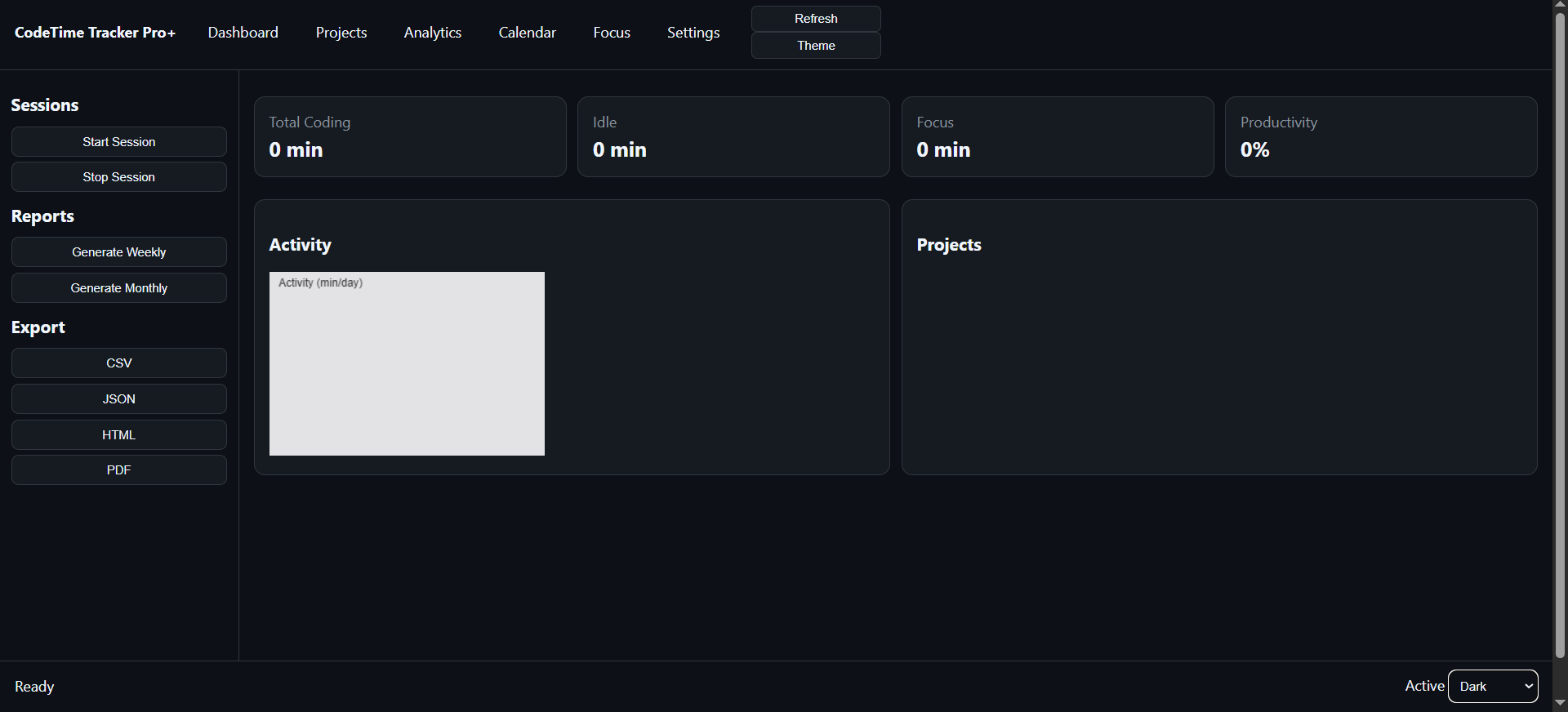 It records your active coding sessions, detects idle time, measures productivity, and generates visual reports — entirely offline.