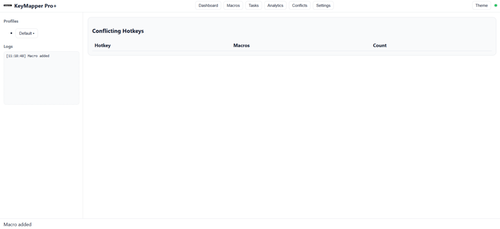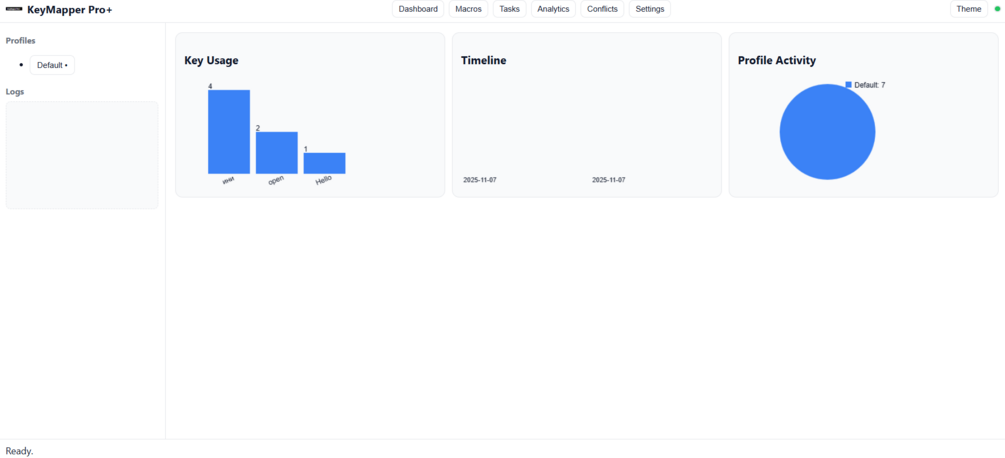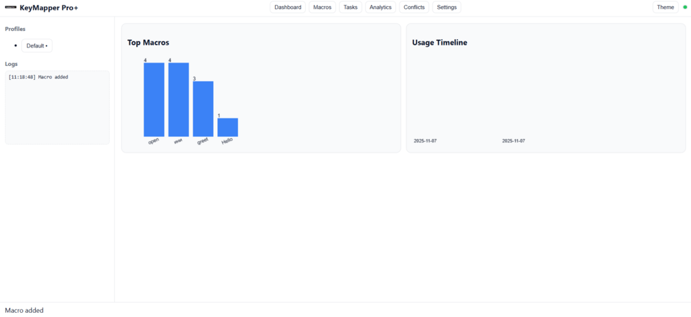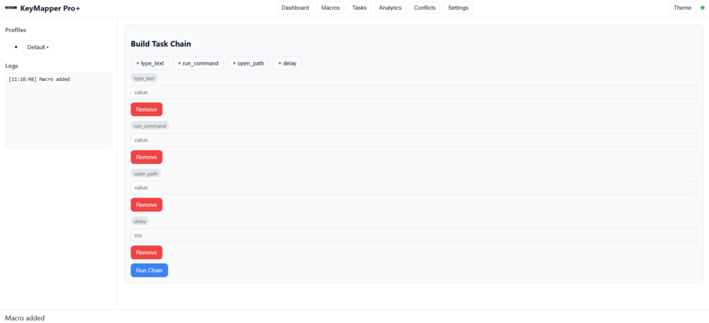 KeyMapper Pro+ turns your hotkeys into workflows — create macros, build task chains, resolve conflicts, and track analytics — all fully offline.
