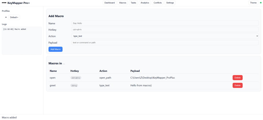 🎯 Macro Engine — create hotkey-based actions for commands, scripts, or text input